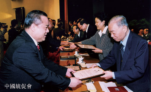 全国人大常委会副委员长蒋正华(右四)、全国政协副主席张克辉(右一)为海外及港澳理事颁发证书