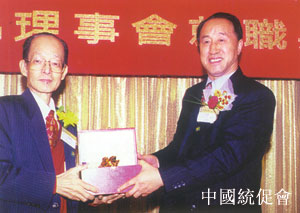 王北新(右)转赠全国政协副主席、中国和平统一促进会会长万国权为香港地区中国和平统一促进会成立题辞“和平统一,一国两制”