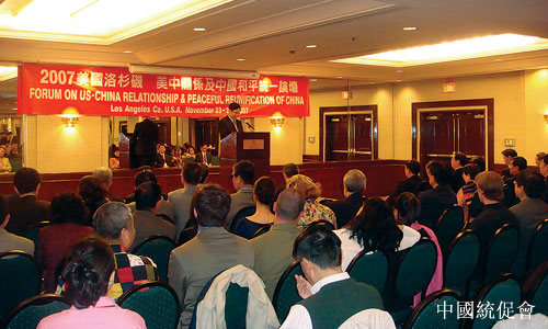 2007年11月16日至27日,以中国和平统一促进会副秘书长韩元秀为团长的中国和平统一促进会访问团应邀出席了在华盛顿举行的“全球促进中国和平统一高峰论坛”和在洛杉矶举行的“美中关系暨中国和平统一论坛”。访问团还先后拜访了中国驻美国大使馆和十几家反“独”促统团体组织的负责人和华侨华人代表,进行了座谈交流。