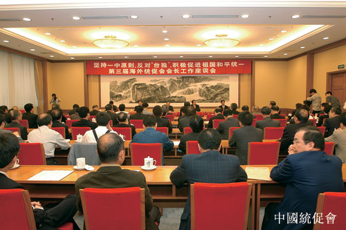 2004年9月28日,“坚持一中原则,反对‘台独’,积极促进祖国和平统一”第三届海外统促会会长工作座谈会在北京举行。来自港澳和海外40多个国家和地区的100多位统促会会长出席了座谈会。