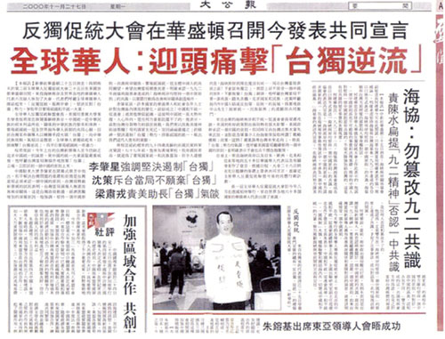 2000年11月25日至26日,由美国全球华人反“独”促统联盟发起召开的“全球华人反独促统大会”在美国华盛顿举行。来自40多个国家和地区的中国和平统一促进会的负责人及华侨华人代表共500多人出席了会议。