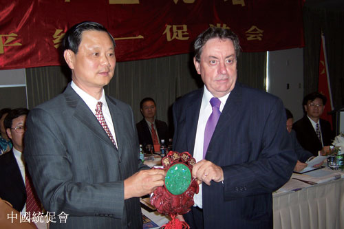 中国和平统一促进会副秘书长王长鱼(右)向此次会议的主办者新西兰中国和平统一促进会赠送纪念品