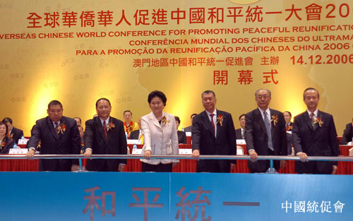2006年12月14日至15日,全球华侨华人促进中国和平统一大会在澳门举行。来自全球50多个国家和地区的1000余名代表出席大会。中共中央政治局常委、全国政协主席、中国和平统一促进会会长贾庆林致信祝贺。