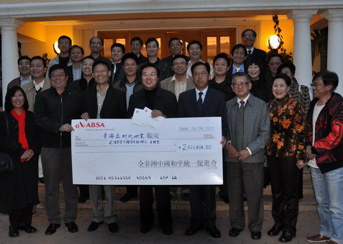 中国经济网约翰内斯堡4月27日讯(记者马海亮) 中国驻约翰内斯堡总领馆4月26日傍晚举行了南非华人华侨向青海玉树地震灾区捐款交接仪式。全非洲中国和平统一促进会会长吴少康代表34个南非华人华侨社团组织及个人向房利总领事递交了总额为2,010,414兰特(27.4万美元)的赈灾捐款,向青海玉树地震灾区的同胞献上南非华人华侨的爱心。