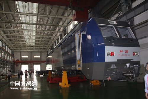 中国和平统一促进会赴湘考察团走进南车株洲电力机车有限公司的生产车间。图为南车株洲电力机车有限公司生产的和谐号动车。(中国台湾网 王君飞 摄)