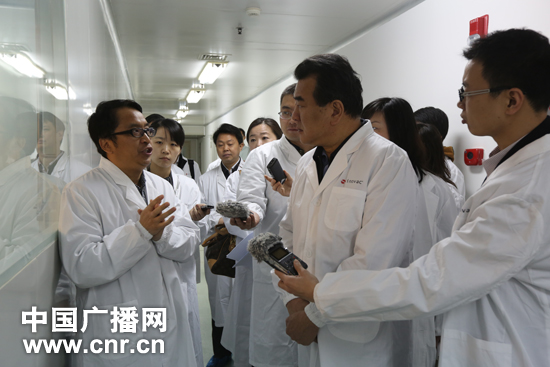 中央人民广播电台“走转改”系列报道《倾听北京 》采访团17日来到北京科兴控股生物技术有限公司。图为由王求台长(右二)率领的采访团在了解北京科兴的疫苗生产设备。(记者 涂傲/摄)