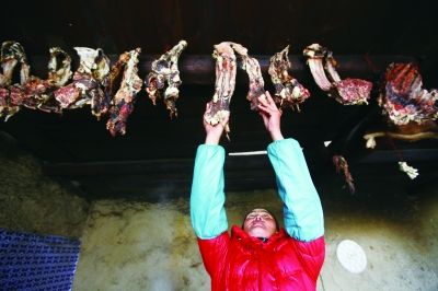 白马人家家户户都在自家房梁上挂上腊肉,腊肉一般都留给最尊贵的客人吃。