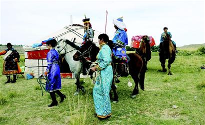 举行婚礼之前,男家蒙古包移至女家附近,并另立一属新包当新房。婚礼在婚家或新房举行,婆家往房只做一般待客用。整个婚礼仪式包括送席和娶亲两项过程,各有若干仪式,一般进行两天。清早装束整齐的新郎及其父母给女家送去6头和24头的食品礼,双方来宾都到女家,除女家盛宴待客外,还举行新娘束发仪式和两位情人接受亲友们赠送的礼品仪式。新娘束发,由其生母先咏颂“解发词”,后解开女儿头发少许,接着由伴娘引新娘入房梳妆,伴娘边唱边将数条小穗发辫梳成六根新娘发辫,配戴各种首饰,穿上结婚礼服,佩上特别的装饰品,梳妆完毕,等待佩彩。