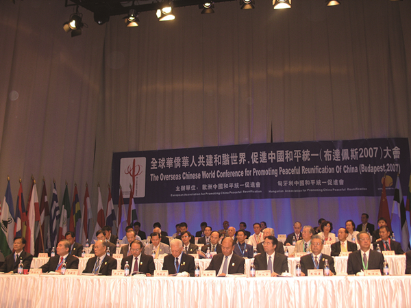 2007年8月8日,匈牙利中国和平统一促进会联合欧洲中国和平统一促进会共同举办“全球华侨华人推动中国和平统一(布达佩斯)大会”,来自30多个国家和地区的500多名代表齐聚一堂,围绕“构建和谐两岸关系、共建和谐世界、促进中国和平统一”主题进行深入研讨。全国政协副主席、中国统促会副会长周铁农出席大会并做主旨发言。会议期间,在匈牙利亚洲中心举办了“一个中国、和平发展——中国台湾问题图片展”,以珍贵的历史图片和翔实的文字资料介绍了台湾的历史和现状。会后,发表了《布达佩斯宣言》,对陈水扁当局执意进行“台独”分裂的种种挑衅和冒险表示强烈谴责和坚决反对,号召全球中华儿女共同携手,构建和谐两岸关系、共建和谐世界、促进祖国和平统一。