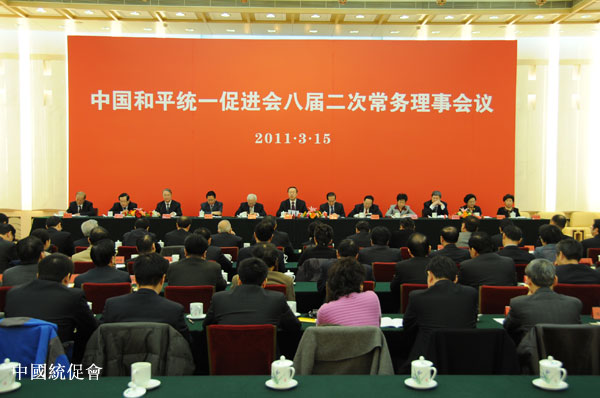 新华网北京3月15日电(记者林甦)中国和平统一促进会15日在京召开八届二次常务理事会。全国政协副主席、中共中央统战部部长、中国和平统一促进会执行副会长杜青林出席会议并讲话。