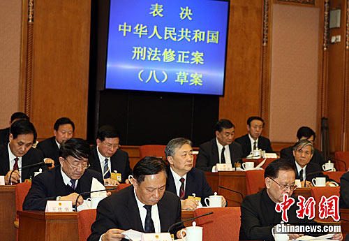 十一届全国人大常委会第十九次会议25日下午经表决,通过了刑法修正案(八)。此次刑法修改的重点之一是取消了近年来较少适用或基本未适用的13个经济性非暴力犯罪的死刑。中新社记者 任晨鸣 摄