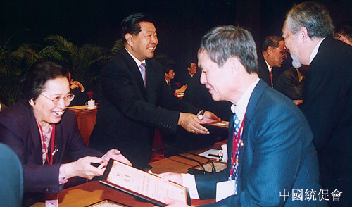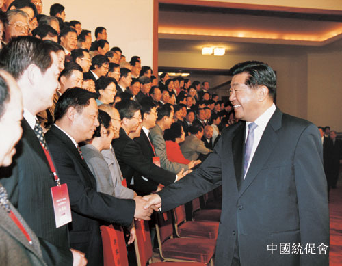 中共中央政治局常委、全国政协主席、中国和平统一促进会会长贾庆林与理事亲切握手