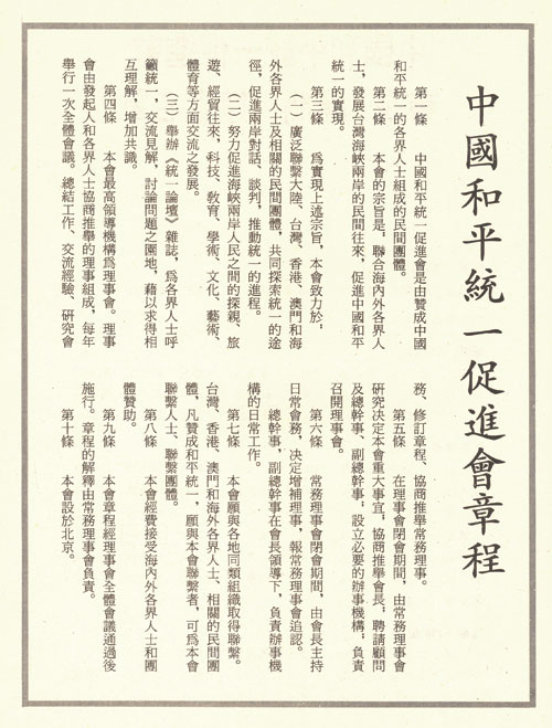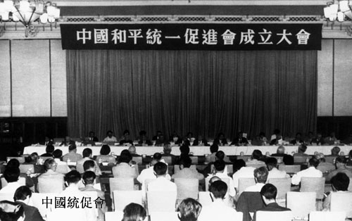 1988年9月22日,由社会各界人士组成的促进中国和平统一的民间团体“中国和平统一促进会”在北京宣告成立,参加发起的二十三家单位为各民主党派和有关人民团体。