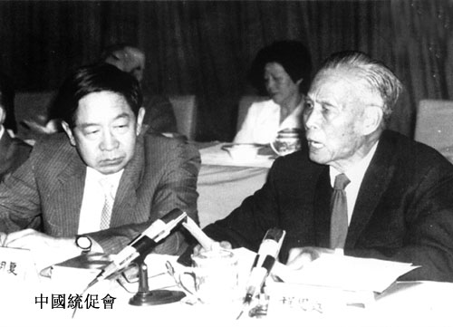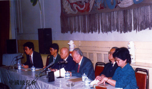 1988年9月23日,中国和平统一促进会会长钱伟长、程思远、孙越崎、吴国祯在北京举行中外记者招待会,