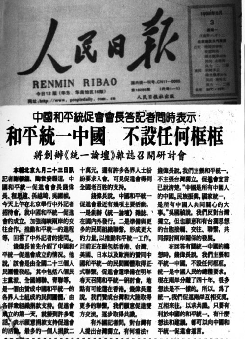 1988年9月23日,《人民日报》刊登了中国和平统一促进会会长答记者问时表示:“和平统一中国,不设任何框框”