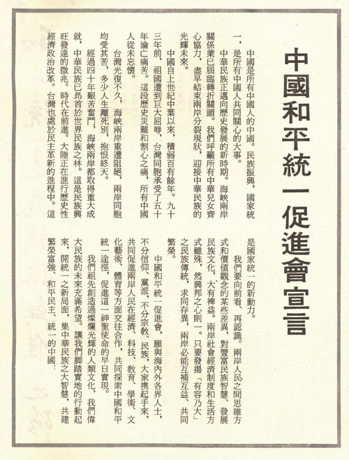 1988年9月22日,《人民日报》海外版刊登了中国和平统一促进会在京成立的消息