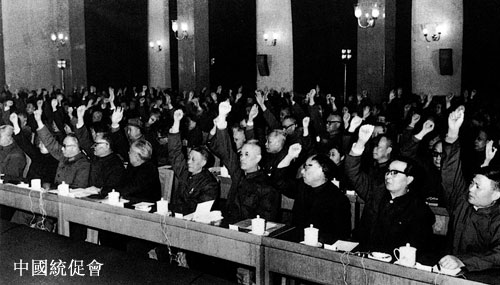 从此,中国人民在中国共产党的领导下各项事业飞速发展,取得了辉煌成就,也为海峡两岸的和平统一奠定了基础。图为委员们举手一致通过中共十一届三中全会会议公报