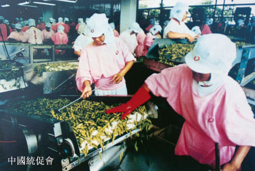图为福建龙海冷冻食品有限公司利用台资建成中国生产能力最大的保鲜蔬菜加工出口企业,工人在加工出口青毛豆