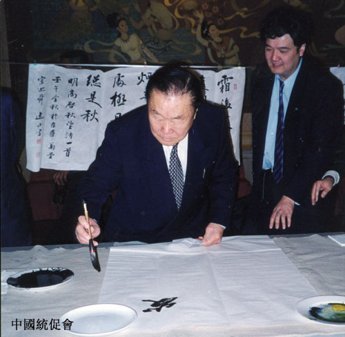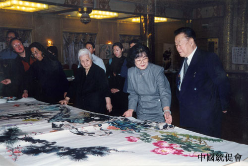 2002年10月22日,中国和平统一促进会举办“喜迎十六大,中国和平统一促进会金秋书画笔会”,全国政协副主席、中国和平统一促进会会长万国权与书画家们合影。