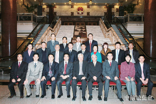 全国政协副主席、中国和平统一促进会副会长罗豪才(前排右五)会见访问团成员并合影留念