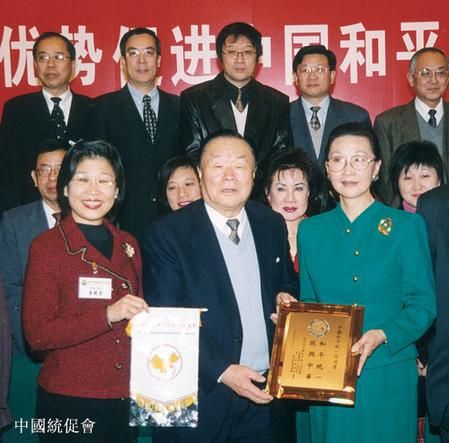 中国和平统一促进会和访问团共同举办“发挥各自优势,促进中国和平统一”座谈会。中国和平统一促进会会长万国权(中)接受访问团赠送的纪念品