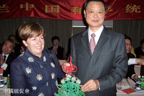 新西兰中国和平统一促进会会长黄玮璋向出席开幕式的国会议长Anni Hall赠送大会纪念品