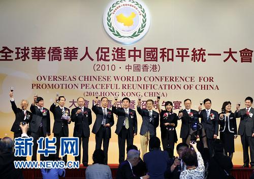 9月22日,主办方和嘉宾向大会祝酒并宣布大会闭幕。当日,全球华侨华人促进中国和平统一大会在香港闭幕并通过《香港宣言》。新华社发(邱仲权 摄)新华网香港9月22日电 为期两天的全球华侨华人促进中国和平统一大会(2010·中国香港)22日在港圆满闭幕。与会者在闭幕式上一致通过了大会纲领性文件《香港宣言》,全文如下: 值此庚寅金秋,来自祖国大陆和台湾、香港、澳门地区的中华儿女,同来自世界各地的炎黄子孙聚首一堂,在美丽的香江之畔共睹“一国两制”之风采,共感两岸双赢之新局,共擎和平发展之大纛,共襄国家统一之伟业。 天行大道,地行大荣,世行大同,国家统一是中华民族根本利益所在,是我们庄严的历史使命。历经辛亥革命后一个世纪的沧桑巨变,百年前孱弱的中国,重振雄风,豪迈地跻身于世界强国之林;台海形势峰回路转,两岸关系业已顺利实现历史性转折。上述两大背景孕育出本次大会的主题:“推进和平发展,促进和平统一,实现民族复兴”。 和平发展是两岸主流民意,是祖国和平统一的必经之路。2005年,在经历了两岸长期隔绝、两岸关系跌宕起伏之后,国共两党领导人顺应历史潮流,在坚持反对“台独”、坚持“九二共识”的政治基础上,以博大的胸怀和宏大的气魄,共同走出历史风雨,为和平发展奠定基础。2008年台湾政局发生巨变,两岸双方开启全新思维,遵循“建立互信、搁置争议、求同存异、共创双赢”的基本精神,坚持先易后难、先经后政、把握节奏、循序渐进的灵活策略,务实推进两岸关系进程,逐步破解前进道路上的难题,奏响了和平发展的时代主旋律。 共创双赢是两岸同胞的共同期待,是两岸累积互信、求同存异的结晶。一旦干戈化为玉帛,两岸的剑拔弩张将一去不返,两岸人民可尽情共享和平发展带来的成果。祖国大陆颁布了一系列政策措施,给台湾各界,尤其是农工商界和基层民众带来诸多便利和实惠。“大三通”的顺利实施,两岸签署“经济合作框架协议”(ECFA),使两岸同胞的利益和命运更加紧密地联系在一起,为实现两岸共同繁荣,实现中华民族伟大复兴,提供了历史性机遇。 |