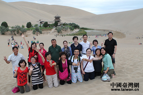 海内外华文媒体一行参访敦煌鸣沙山、月牙泉。(中国台湾网发)