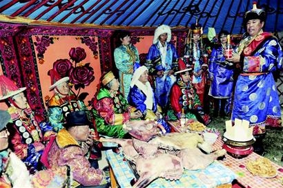 举行婚礼之前,男家蒙古包移至女家附近,并另立一属新包当新房。婚礼在婚家或新房举行,婆家往房只做一般待客用。整个婚礼仪式包括送席和娶亲两项过程,各有若干仪式,一般进行两天。清早装束整齐的新郎及其父母给女家送去6头和24头的食品礼,双方来宾都到女家,除女家盛宴待客外,还举行新娘束发仪式和两位情人接受亲友们赠送的礼品仪式。新娘束发,由其生母先咏颂“解发词”,后解开女儿头发少许,接着由伴娘引新娘入房梳妆,伴娘边唱边将数条小穗发辫梳成六根新娘发辫,配戴各种首饰,穿上结婚礼服,佩上特别的装饰品,梳妆完毕,等待佩彩。