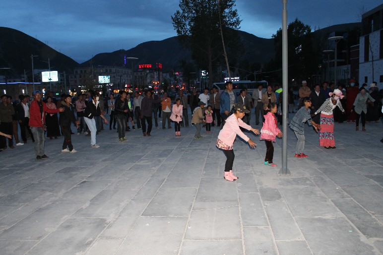 傍晚,太阳慢慢下沉,月亮犹抱琵琶半遮脸的时候,玉树人的快乐开始了。在玉树州文化中心前面的广场上,人们载歌载舞跳着郭庄,一种藏族最普及的舞蹈。锅庄舞,又称为“果卓”、“歌庄”、“卓”等,藏语意为圆圈歌舞,是藏族三大民间舞蹈之一,分布于西藏昌都、那曲,四川阿坝、甘孜,云南迪庆及青海、甘肃的藏族聚居区。锅庄分为用于大型宗教祭祀活动的“大锅庄”、用于民间传统节日的“中锅庄”和用于亲朋聚会的“小锅庄”等几种,规模和功能各有不同。舞蹈时,一般男女各排半圆拉手成圈,有一人领头,分男女一问一答,反复对唱,无乐器伴奏。整个舞蹈由先慢后快的两段舞组成,基本动作有“悠颤跨腿”、“趋步辗转”、“跨腿踏步蹲”等,舞者手臂以撩、甩、晃为主变换舞姿,队形按顺时针行进,圆圈有大有小,偶尔变换“龙摆尾”图案。
