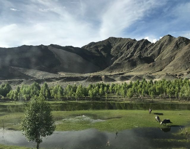 青藏铁路延伸线拉萨至日喀则市列车于2014年8月15日开通。从列车车窗往外看,夏日里群山间的年楚河畔,一幅高原牧歌图。